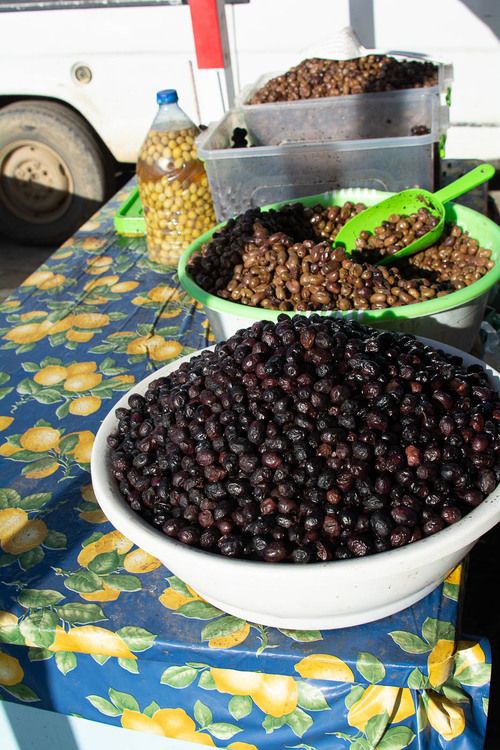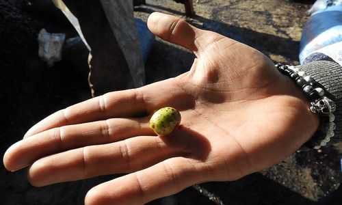 On the right is a truck transporting a load of picked olives to the processing plant.