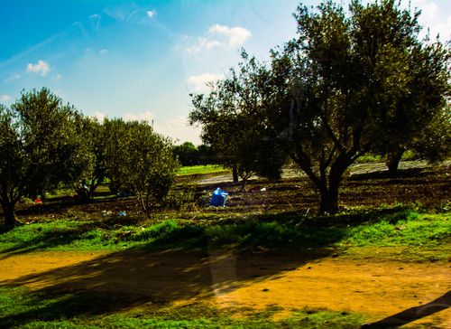 At left is one of the many olive groves along this route. Looking closely you can see the folks picking the olives and bagging them in the blue bags.