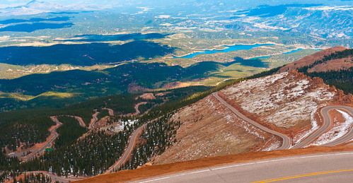 The Pikes Peak Highway starts in Cascade, CO at an elevation of 7750 feet. It winds its way some 19 miles to the summit at 14,110 feet. We arrived at the gatehouse at 8:00am only to find out that road opens at 9:00am, so our first hour was spent waiting in line. The round trip took about 2½ hours.