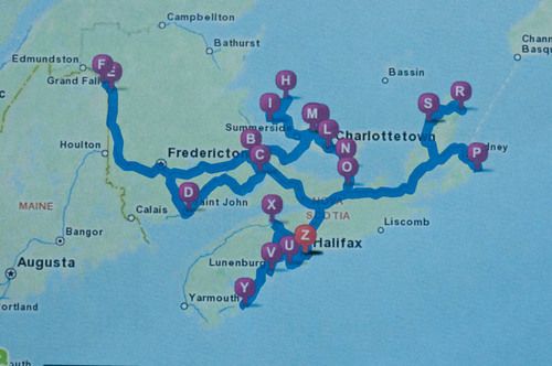 On August 2, 2011 we flew into Halifax and rented a Ford Fusion. Over the next two weeks we put over 2700 miles on the car. Above is a rough map of our route. We made blog postings of most of these locations. To see these postings click here and then select the category of your interest. Example - for Peggy's Cove select the category Nova Scotia once you are on the blog posting page.