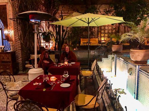 Our dinner the first night in Marrakech was in the outdoor courtyard of the Palais Sebban. It was super cold. We were given monk like robes to ward off the cold. Chris had chicken with seffa (some type of spaghetti). Bob had couscous with chicken.