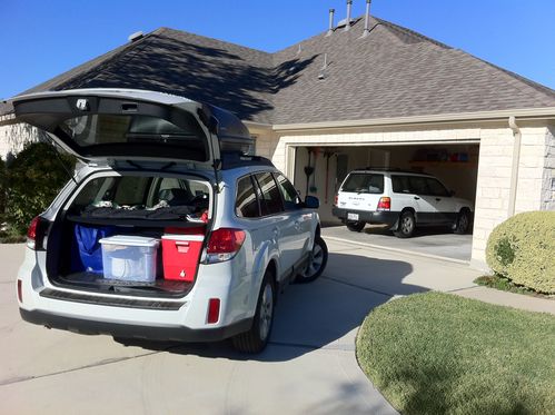 We have our new Subaru Outback packed and loaded as we start our 30 day road trip. We left at 12:58pm on October 3, 2011. This trip will take us through Texas, New Mexico, Arizona, California, Oregon, Utah, Colorado as we eventually make our way back homw. The focus of the trip is to see family and attend a photography workshop. To see our blogs for the trip click here. Then go to the category October 2011.
