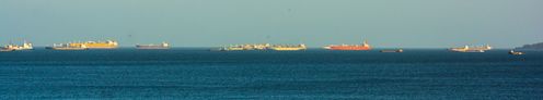 It took us about 7 hours to do the full transit. Below are ships lined up to enter the canal from the Pacific side. Once in position they wait about 20 hours before starting their journey through the canal.