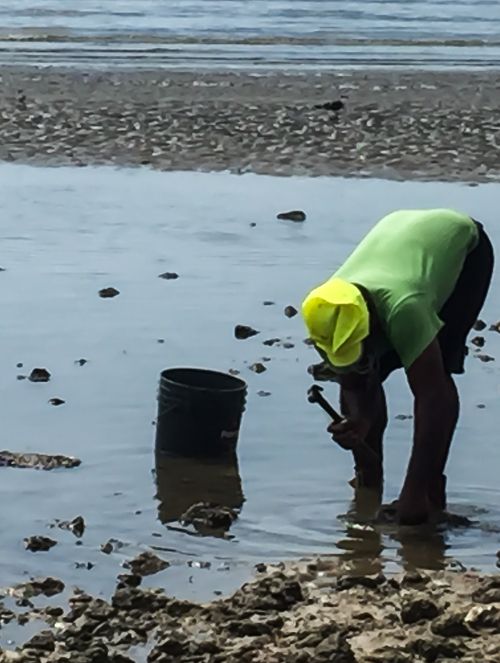 One morning during our walk at low tide, a young man was pounding on rocks with a hammer. After a few minutes of observing, we realized that he was collecting oysters. Here are a couple of photos of his endeavors.