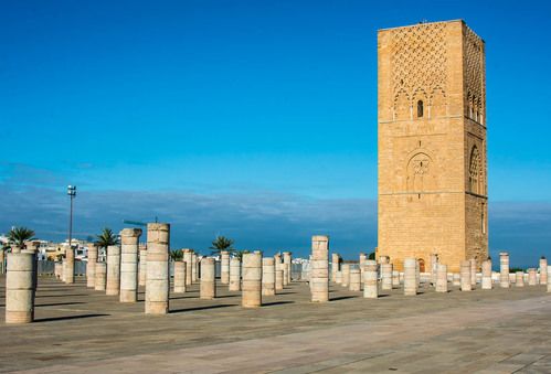 Hassan Tower was built as part of the Hassan Mosque by Yacoub el-Mansour, an Almohad ruler. The unfinished mosque fell into disrepair after the 1199 death of Yacoub el-Mansour. The unfinished minaret is all that is left. The mosque was supported giant columns. Remains of these columns are seen in the photo at right.