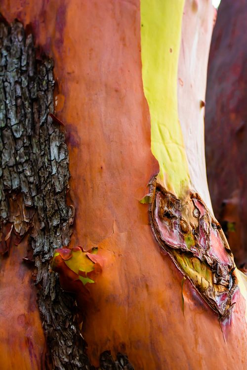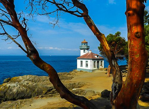 This 42 acre park is on the western shore of San Juan Island. It is supposed to be one of the best shore based places in the world to view orcas due to its bathymetric characteristics. We didn't see any orcas from this point. We did photograph the Lime Kiln Lighthouse through a Pacific Madrone tree. As the madrone grows it sheds its bark. This bark is then replace with a new layer. The image at right shows three stages of bark growth.